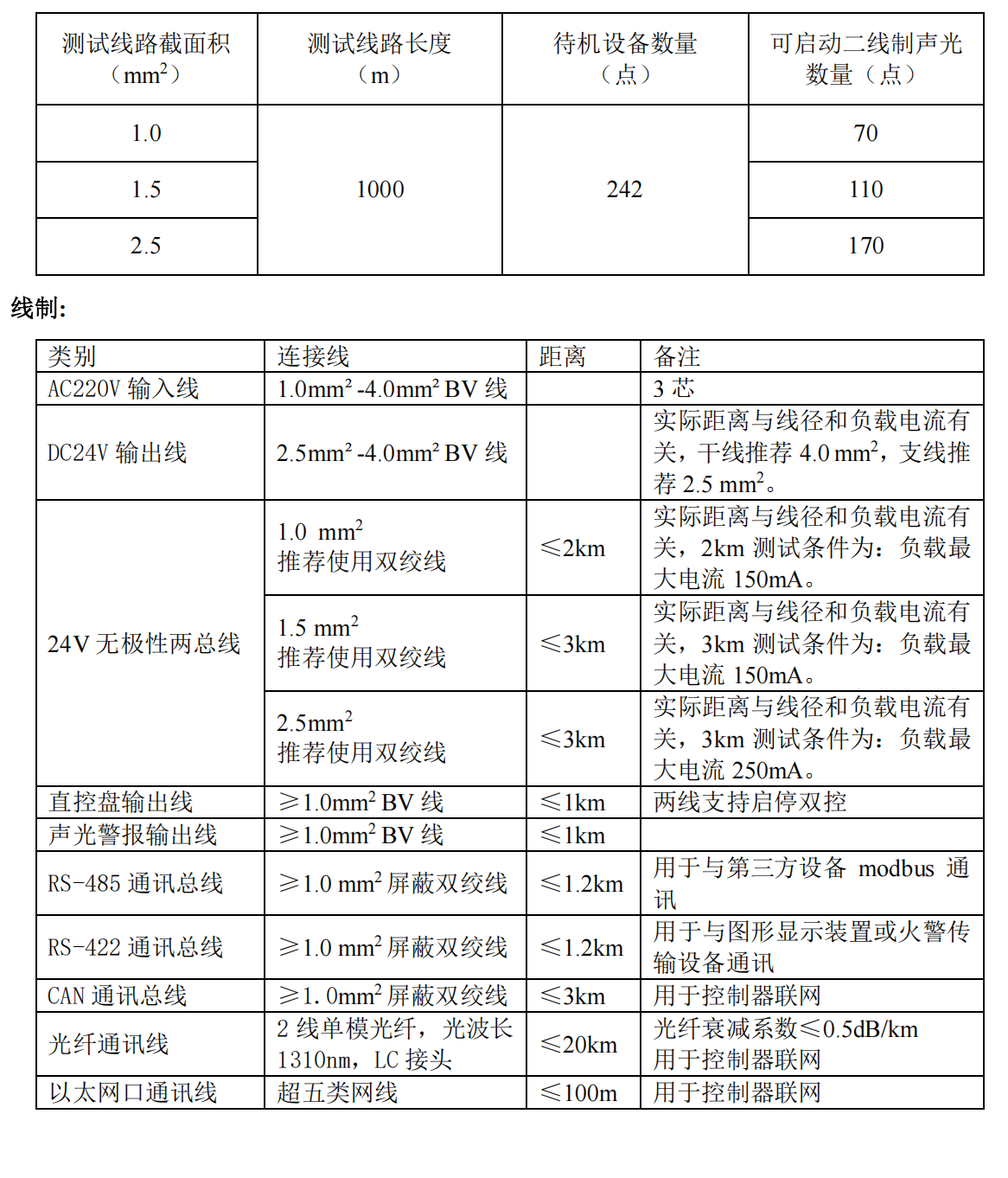 下表給出不同線徑條件下 1 個(gè)回路可配接的二線制聲光警報(bào)器數(shù)量作為參考。